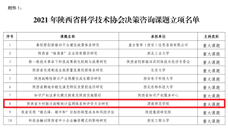 获批的重大课题《陕西省乡村振兴战略统计监测体系和评价方法研究》通过反映陕西省乡村振兴战略要求的统计指标体系,一方面,对陕西省乡村振兴实践进行直观定量评价,科学、准确反映乡村振兴战略具体实施效果,为推进乡村振兴战略提供基础数据和统计服务;另一方面,为评价陕西省不同区域乡村振兴发展,因地制宜,统筹规划,精准施策,制定适应新时代高质量发展和推动陕西省乡村振兴战略实施的具体措施提供决策依据。