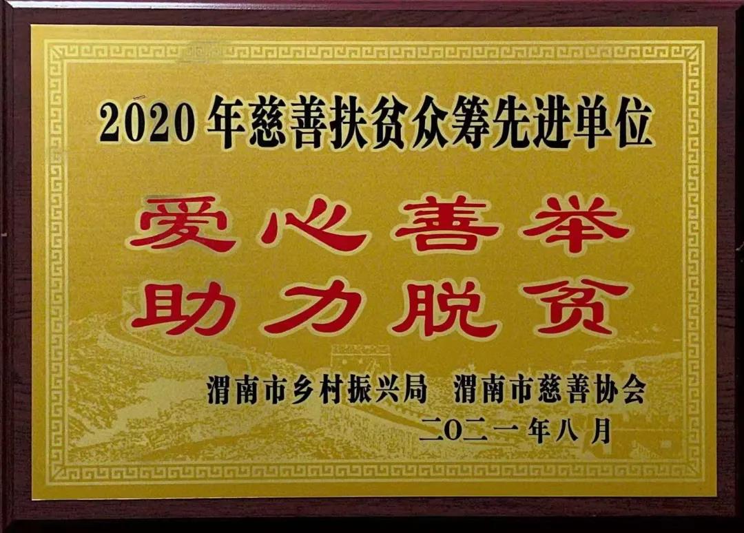 近日,渭南市“9·9公益日”慈善众筹助力乡村振兴动员培训会议召开,会议对2020年度市级机关单位慈善扶贫众筹先进单位作了表彰,bat365官网荣获“2020年慈善扶贫众筹先进单位”称号。
