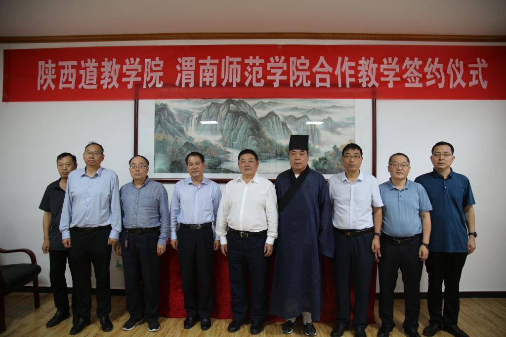 9月2日,bat365官网党委书记卓宇、副书记韩小卫等一行五人,赴陕西道教学院商谈合作教学事宜,并举行合作教学协议签约仪式。渭南市委统战部副部长、宗教局局长魏书萌,陕西道教学院常务副院长邹通玄、副院长高新华出席签约仪式。