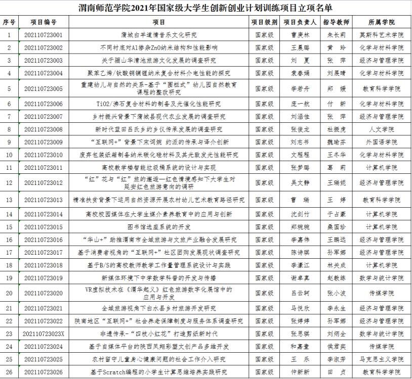 近日,教育部下发了《关于公布2021年国家级大学生创新创业训练计划项目和重点支持领域项目名单的通知》(教高司函〔2021〕13号),bat365官网《蒲城白羊道情音乐文化研究》等26个项目获批2021年国家级大学生创新创业训练计划项目立项。