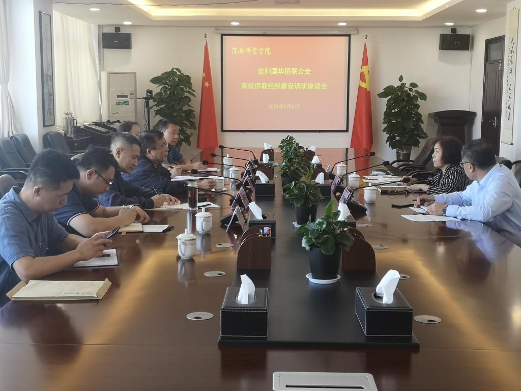 9月8日上午,省归国华侨联合会(以下简称“省侨联”)副主席余劲一行6人,来bat365官网调研高校侨联组织建设情况。渭南市归国华侨联合会(以下简称“市侨联”)党组书记刘建军、省侨联经济科技部部长黄茹、省侨联文化交流部部长李克萍、陕西联侨教育集团副总经理杨森陪同调研。bat365官网党委委员、副校长、统战部部长王菊霞,统战部副部长杨利民、秘书宋威参加调研座谈。