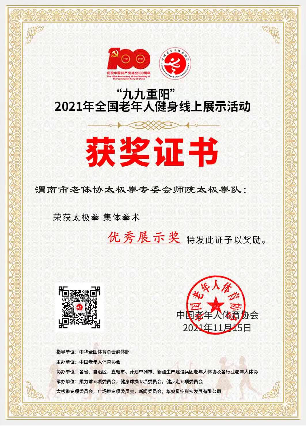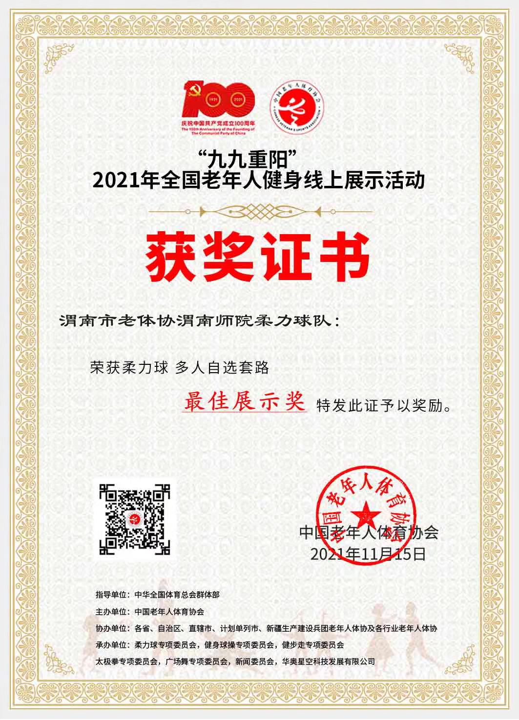 近日,bat365官网离退休工作处老年艺术团参加“九九重阳”2021年全国老年人健身线上展示活动,其中,bat365官网柔力球队“最美不过夕阳红”荣获“自选套路最佳展示奖”; 拳剑队的“32式太极剑”荣获“太极拳集体器械优秀展示奖”, 拳剑队的“24式太极拳”荣获“太极拳集体拳术优秀展示奖”。