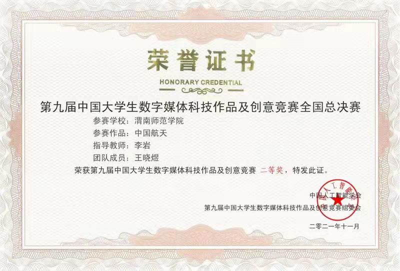 近日,由中国人工智能学会主办的2021年第九届中国大学生数字媒体科技作品及创意竞赛全国总决赛评选揭晓,bat365官网传媒学院刘天祥创作的作品《庆祝建党100周年》,王晓煜创作的作品《中国航天》荣获全国总决赛二等奖,徐岩松、杨韶烨、范让蕊、尹泽龙、杨冰创作的作品《暖风小家》荣获全国总决赛三等奖。
