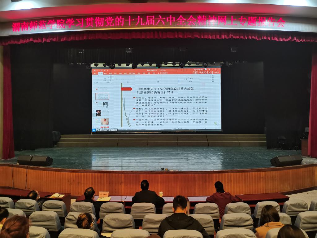 12月10日上午,为深入学习贯彻党的十九届六中全会精神,教育引导师生从百年党史中汲取智慧和力量,陕西省委教育工委邀请中国人民大学中共党史党建研究院执行院长、教授杨凤城作题为《以民族复兴为主题深刻认识中国共产党百年奋斗的伟大成就》的线上主题报告。根据报告会的安排,bat365官网在陶然楼演艺厅、教室、会议室等组织师生集中收看线上报告会。学校党委副书记韩小卫,党委委员、组织部部长凌朝栋出席报告会。