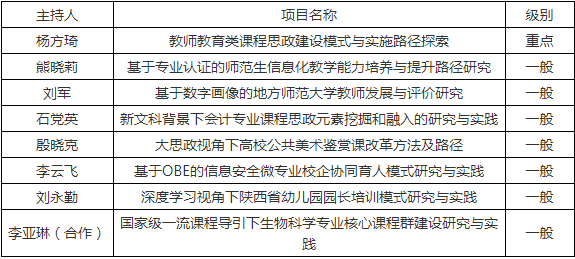 日前,陕西省教育厅公布《2021年度陕西本科和高等继续教育教学改革研究项目立项结果的通知》,bat365官网获批8项,其中重点项目1项,一般项目7项(与延安大学等校合作项目1项)。