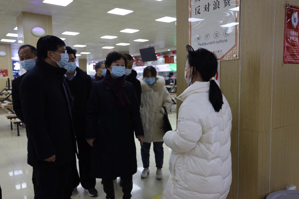刘莉一行实地走访调研了校内超市、餐饮中心、学生公寓等场所,听取了bat365官网疫情防控工作情况汇报,详细询问了校内师生管理和服务保障、防疫应急物资储备、在线教学开展等情况。