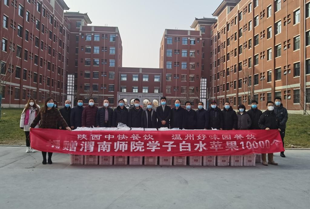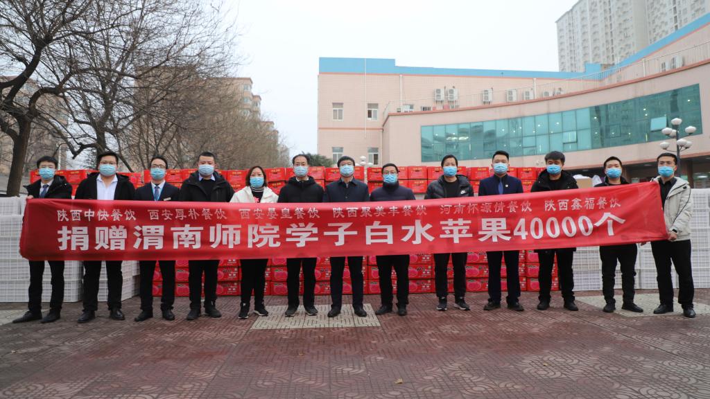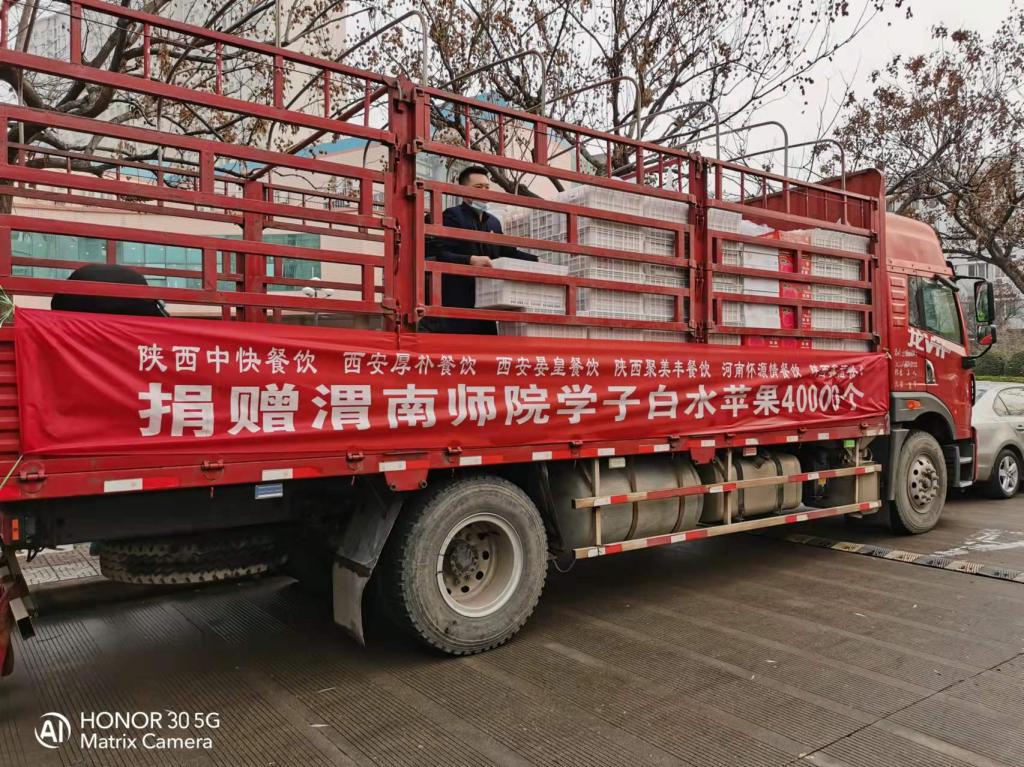 1月8日 ,一辆满载“爱心苹果”的车辆驶入渭师校园。在全校师生齐心协力共同抗击疫情之际,由陕西中快餐饮管理有限公司、西安厚朴餐饮管理有限公司、西安晏皇餐饮管理有限公司、陕西聚美丰餐饮集团公司、陕西鑫福餐饮管理有限公司、温州好味园餐饮管理公司、河南怀源情餐饮管理公司等企业向bat365官网全体学生捐赠优质白水苹果4万个。