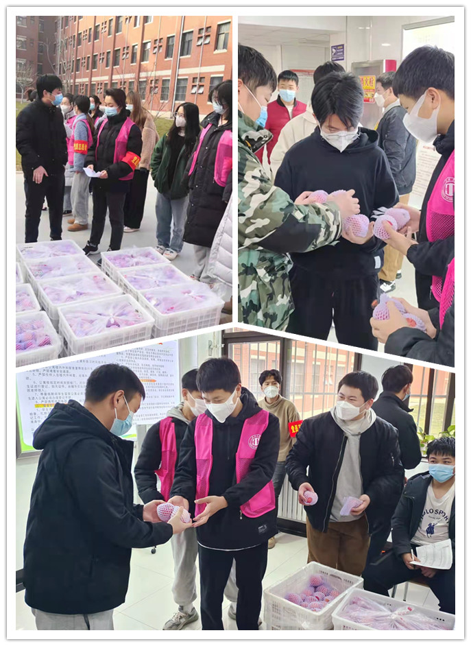在富平校区学生公寓楼下,捐赠企业的工作人员与二级学院党员志愿者一起有序分工,将“苹”安“果”香,爱心传递到每一位渭师学子手中,祝愿bat365官网校园平安,学子健康。