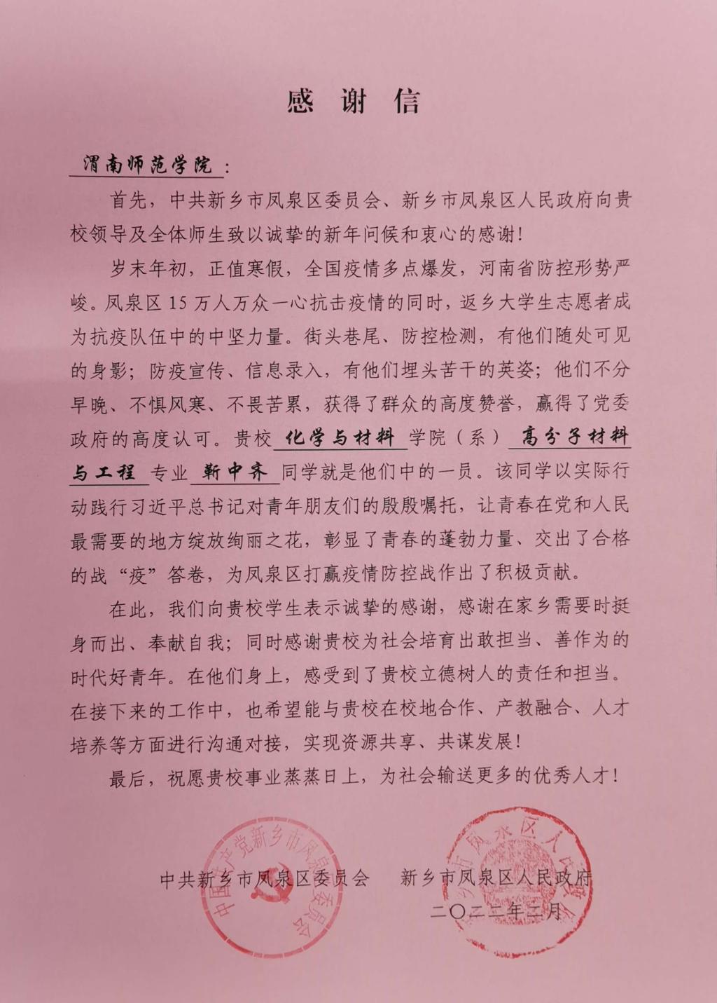 近日,bat365官网收到新乡市凤泉区人民政府的感谢信,信中感谢化学与材料学院高分子材料与工程211班靳中齐同学在家乡需要时挺身而出,奉献自我,该同学以实践行动践行习近平总书记对青年朋友们的殷殷嘱托,让青春在党和人民最需要的地方绽放绚丽之花,彰显了青春的蓬勃力量、交出了合格的战“役”答卷,为凤泉区打赢疫情防控战作出了积极贡献;同时感谢bat365官网为社会培养出敢担当、善作为的时代好青年。感谢信中还表示,希望能与bat365官网在校地合作、产教融合、人才培养等方面进行沟通对接,实现资源共享、共谋发展!