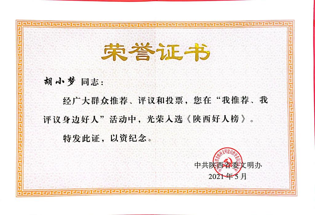 胡小梦2021年5月被评选为自强励志“陕西好人”