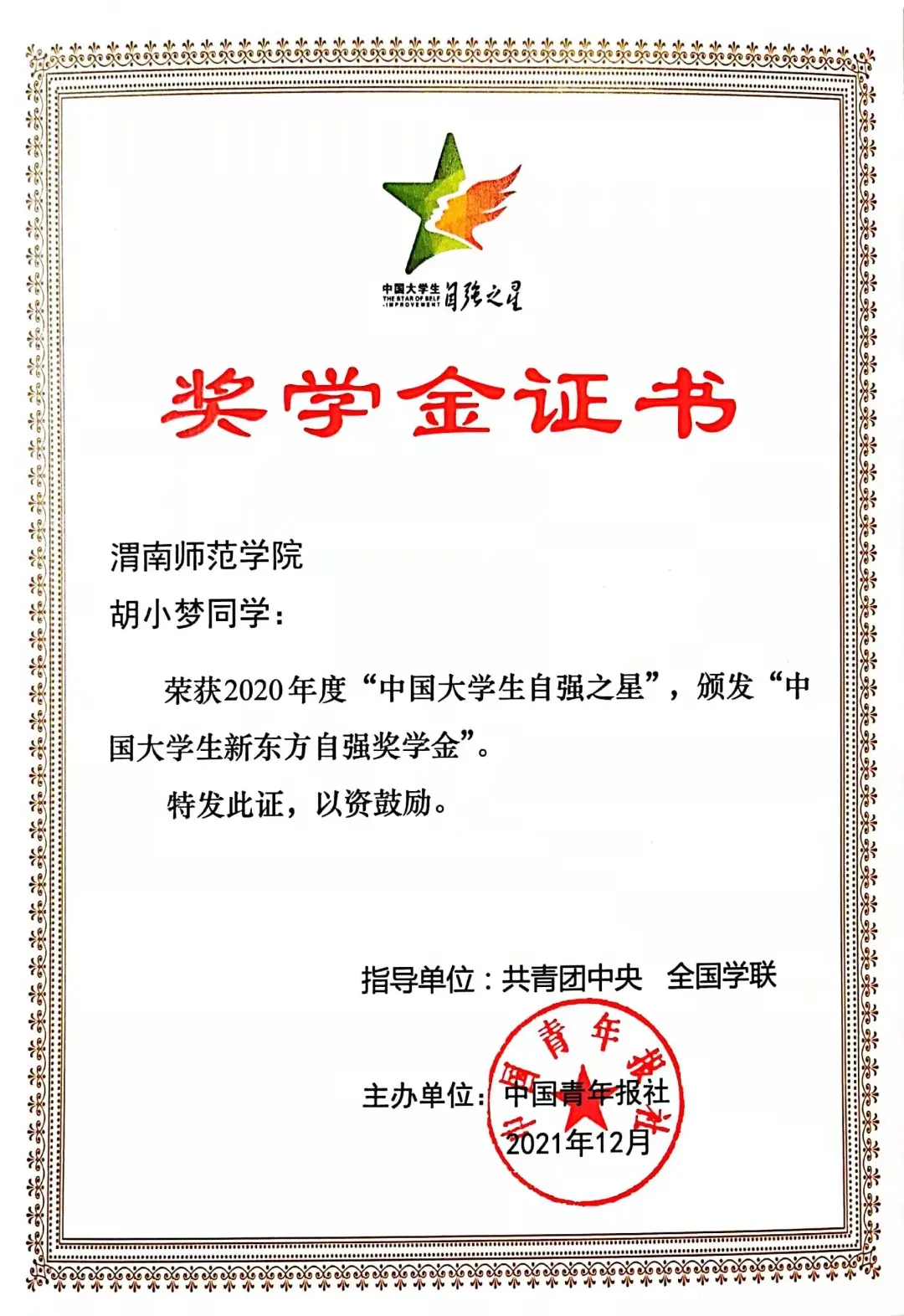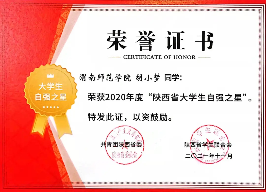 为弘扬自强精神,激励青年奋勇争先,由共青团中央、全国学联指导,中国青年报社、新东方教育科技集团联合开展的2020年度“中国大学生自强之星评选结果于近期揭晓。bat365官网汉语言文学专业201班“向日葵女孩”胡小梦同学荣获2020年度“中国大学生自强之星”、“陕西省大学生自强之星”,同时获得“中国大学生新东方自强奖学金”。