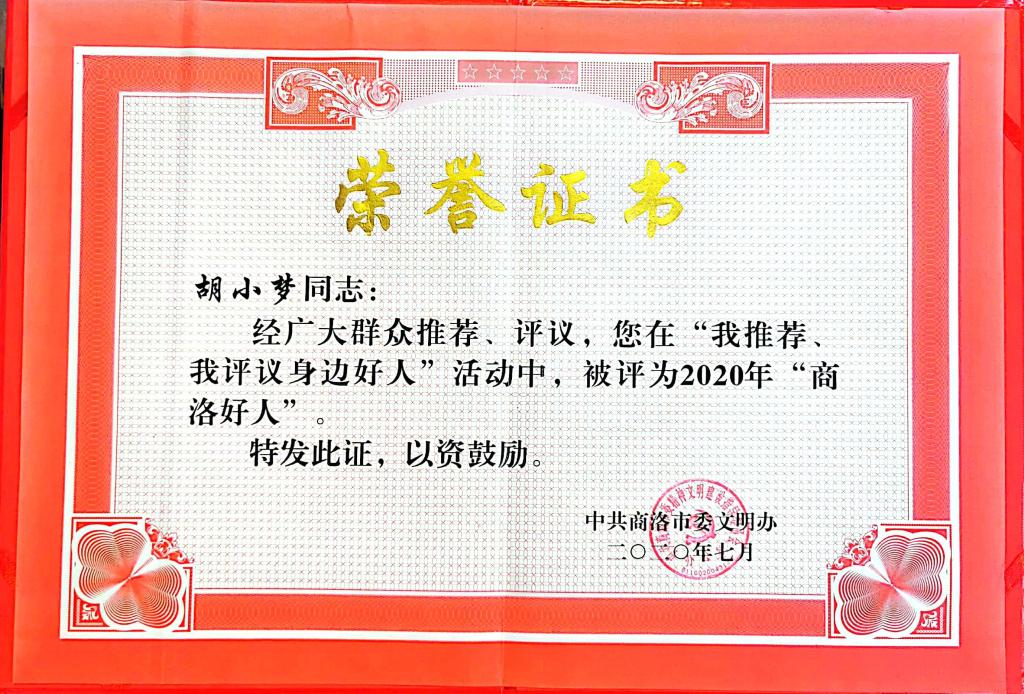 胡小梦2020年7月获得自强励志“商洛好人”