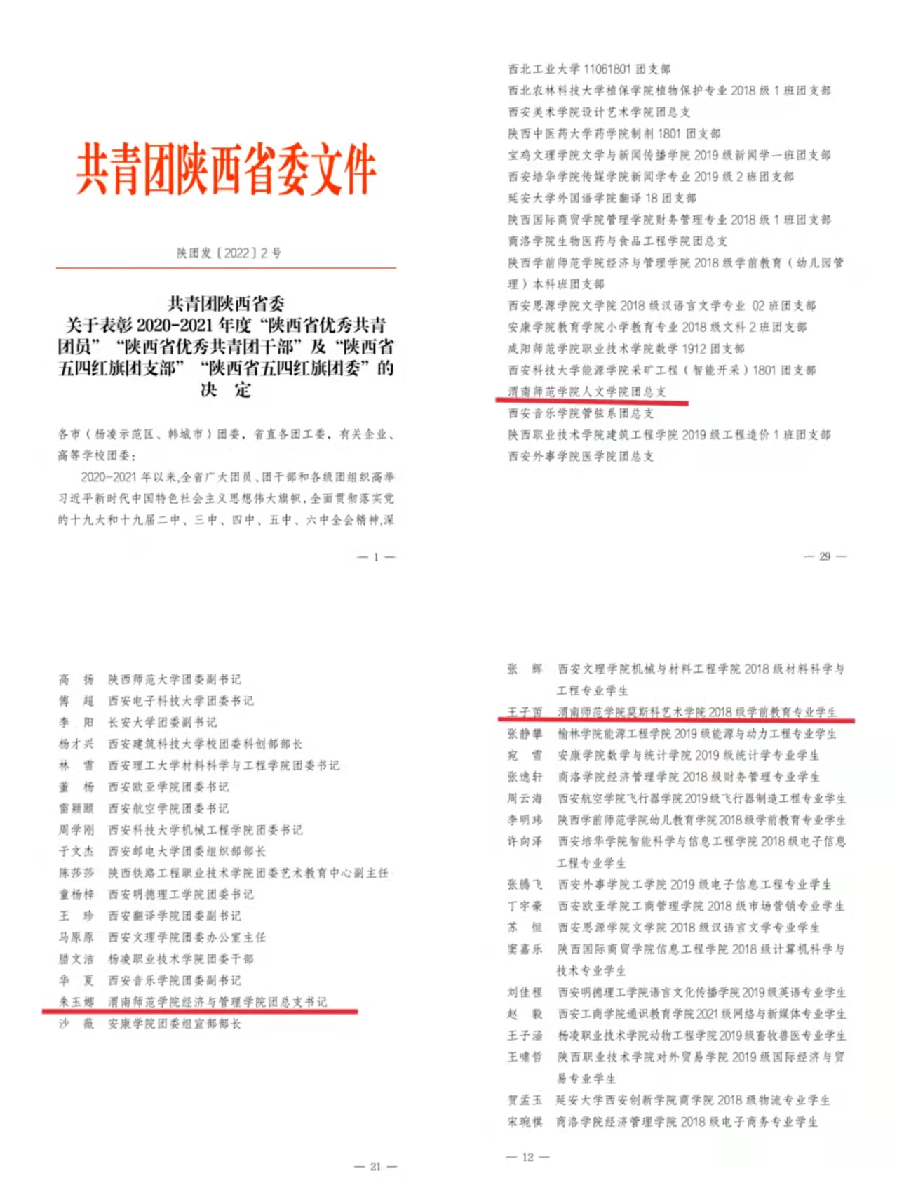 由共青团陕西省委印发的《关于表彰2020-2021年度“陕西省优秀共青团员”“陕西省优秀共青团干部”及“陕西省五四红旗团支部”“陕西省五四红旗团委”的决定》中,bat365官网人文学院团总支获得2020-2021年度“陕西省五四红旗团支部”,经济与管理学院团总支书记朱玉娜获得2020-2021 年度“陕西省优秀共青团干部”,莫斯科艺术学院2018级学前教育专业学生王子茵获得2020-2021年度“陕西省优秀共青团员”。