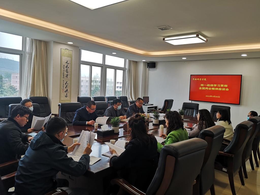 3月30日下午,学校召开统一战线座谈会,专题学习贯彻全国两会精神。党委副书记、统战部部长韩小卫出席会议并讲话,学校各民主党派基层组织、统战团体负责同志参加会议。会议由统战部副部长杨利民主持。