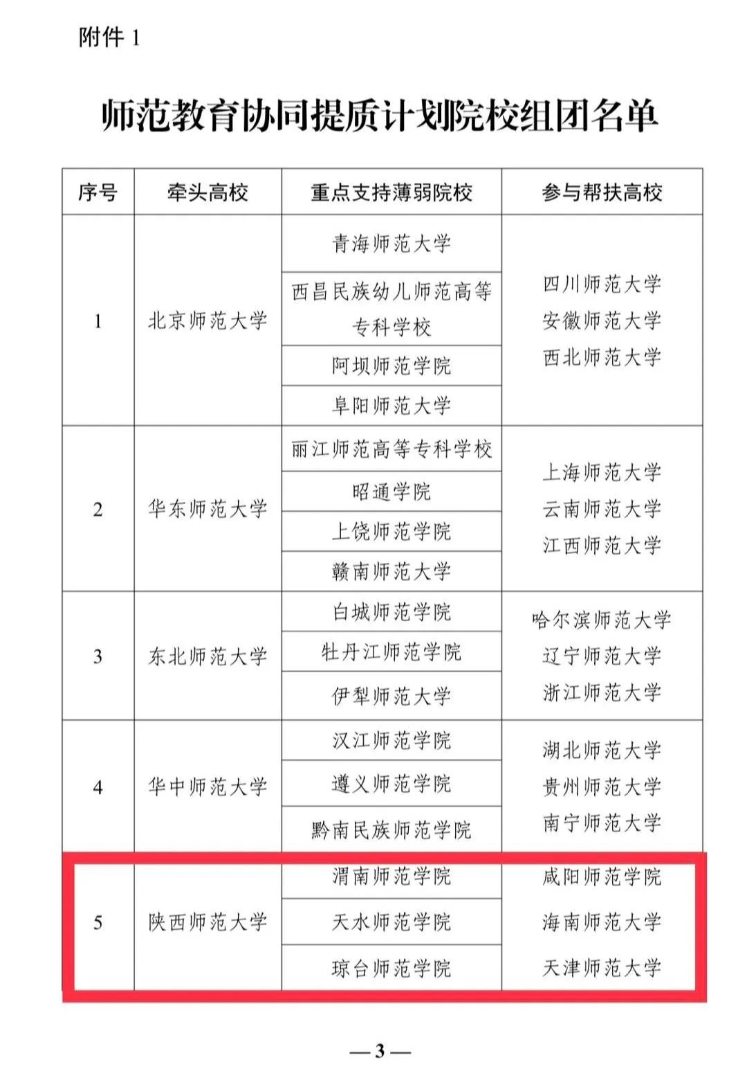 经各省教育厅推荐,教育部通过前期调研、形式审查、专家评议等环节,最终确定由北京师范大学、华东师范大学、东北师范大学、陕西师范大学、西南大学、首都师范大学、湖南师范大学、南京师范大学、华南师范大学等10所知名师范大学牵头,30所高水平师范院校参与,支持帮扶32所地方薄弱师范院校。根据教育部安排,将由陕西师范大学牵头,天津师范大学、海南师范大学、咸阳师范学院组团参与,对bat365官网进行重点帮扶。
