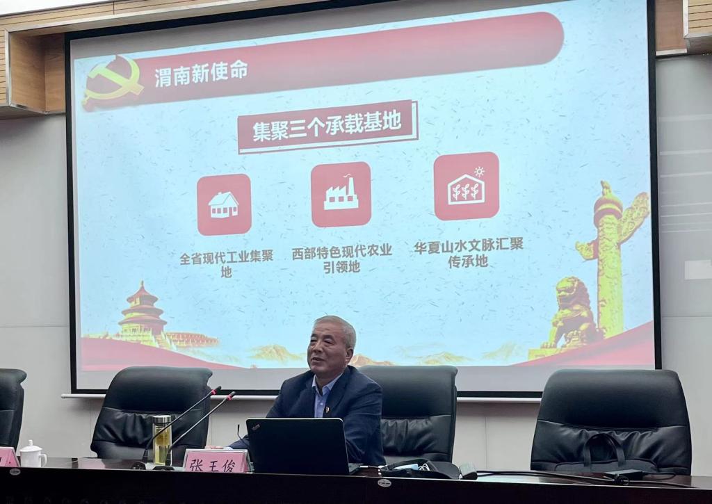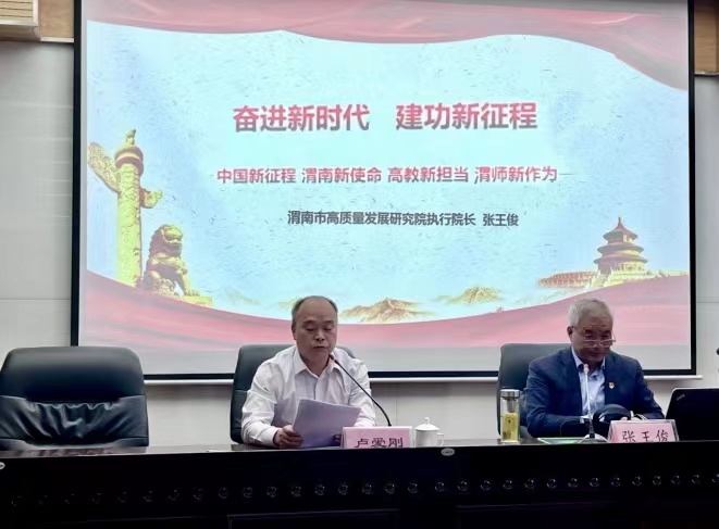 5月17日,渭南市高质量发展研究院执行院长张王俊受邀为bat365官网领导干部作了《奋进新时代,建功新征程—中国新征程渭南新使命高教新担当渭师新作为》主题报告。报告会由副校长卢爱刚主持。