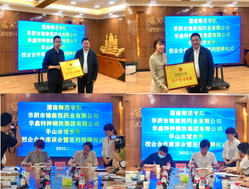 卓宇向陕西华鑫特种钢铁集团有限公司、华阴市锦前程制药有限公司两个企业颁授生产实习基地牌,计算机学院和陕西华鑫特种钢铁集团有限公司、华阴市锦前程制药有限公司分别签订大学生就业基地协议和实践教学基地协议,音乐学院和华山冰雪世界签订大学生就业基地协议。