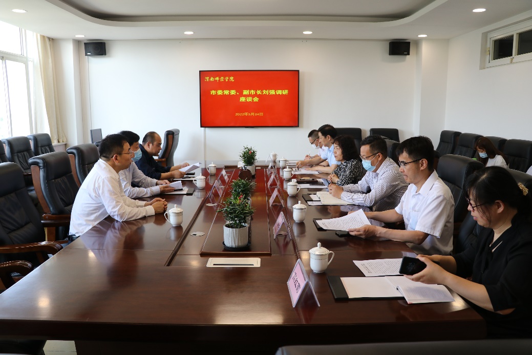 张守华代表学校对刘强一行表示欢迎,介绍了4月份副市长刘强来校调研有关工作推进落实情况及学校下一步发展规划、中外合作办学、申硕升大、人才引进、校地合作等方面工作。