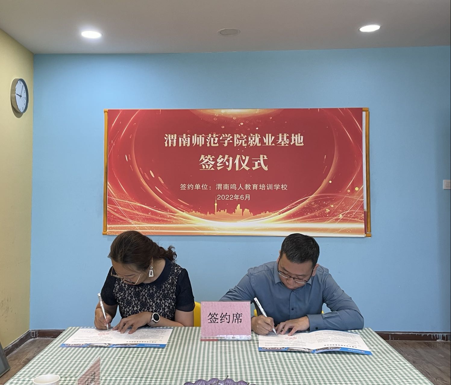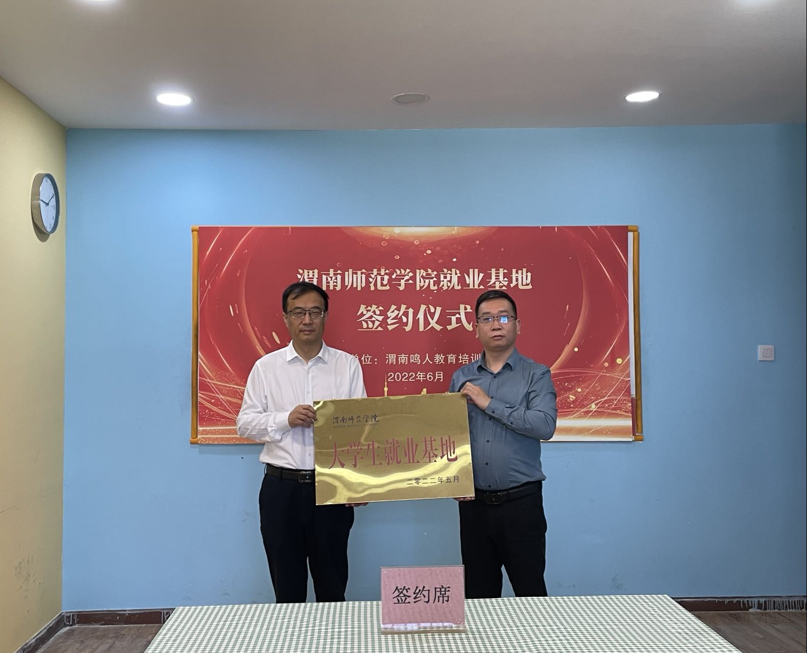 曹强为渭南鸣人教育培训学校授大学生就业基地牌。(通讯员 李萍 审核人 吕健)