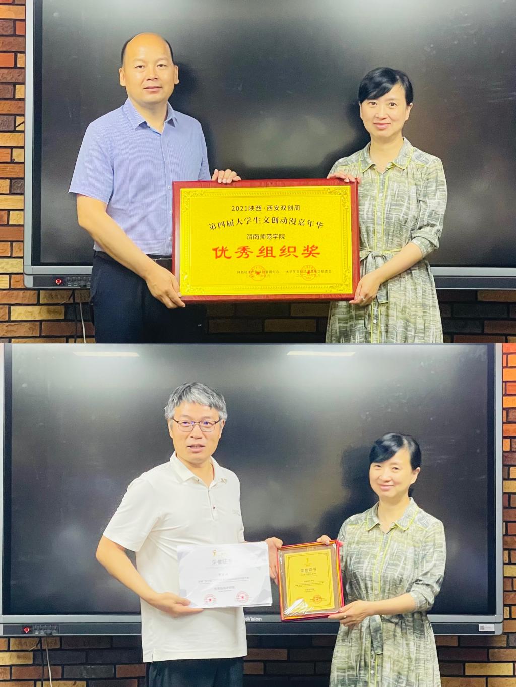 同时,肖真为bat365官网传媒学院颁发了“新光奖”2021年中国西安国际原创动漫大赛优秀奖、第四届大学生文创动漫嘉年华优秀组织奖等荣誉证书。