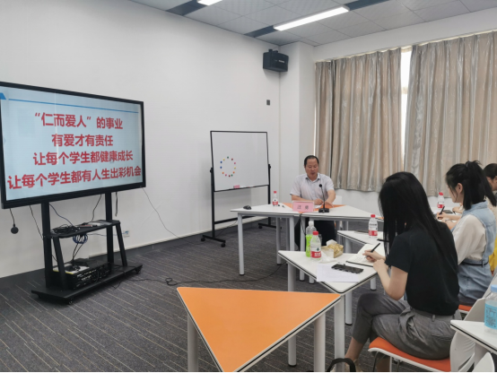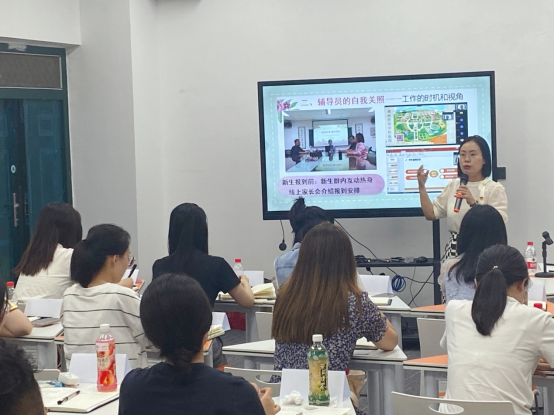 大学生心理健康指导中心主任刘原作辅导员专业成长与自我关注专题培训,分享个人辅导员专业经历,并从工作的时机和视角、幸福生活的“六个一”等层面引导、鼓励新聘辅导员做“心中有爱、眼中有光、手握戒尺、心存感恩”的新时代学生成长引路人。