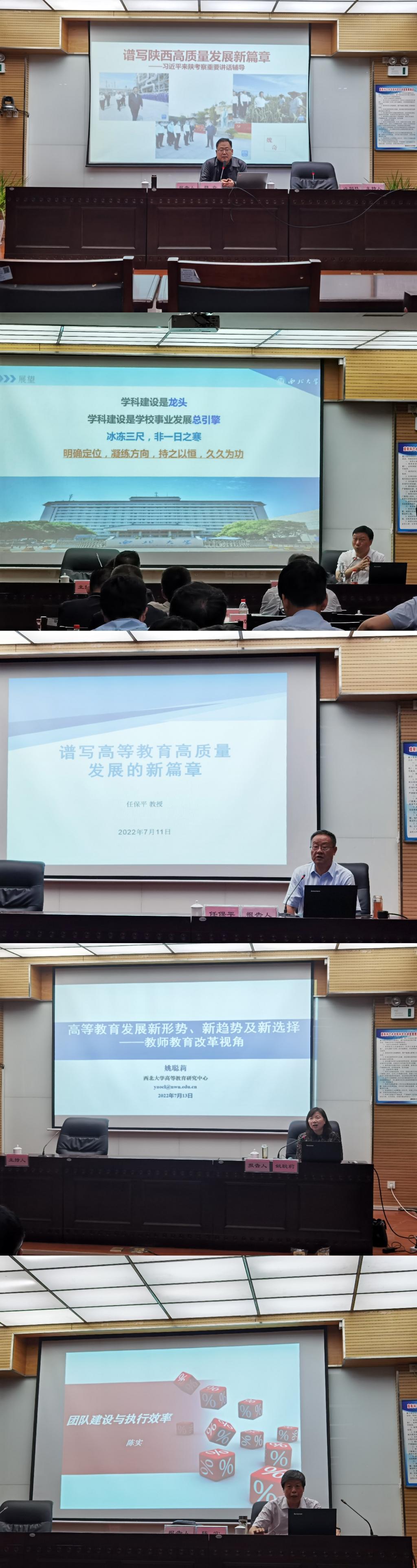 此次培训重点围绕学校中心工作,以理论武装为根本,党性教育为核心,能力提升为主线,先后举办了由魏奇教授、赖绍聪教授、任保平教授、姚聪莉教授、陈实教授讲授的《谱写陕西高质量发展新篇章——习近平总书记来陕考察重要讲话辅导》《双一流背景下的学科建设策略与举措——以西北大学地质学科为例》《谱写高等教育高质量发展的新篇章》《高等教育发展新形势、新趋势及新选择——教师教育改革视角》《团队建设与执行效率》等五场专题辅导报告。