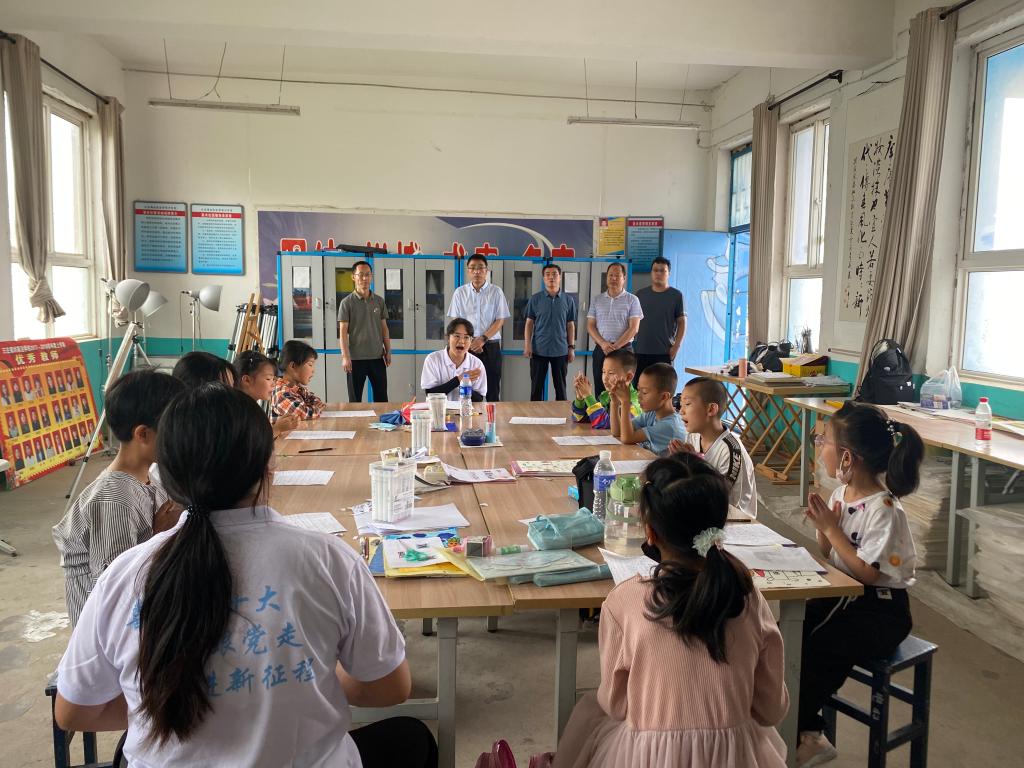 在冯原镇中心学校韩小卫、汪勇一行走进课堂,观看语文、数学、音乐、舞蹈等教学情况,参观了学生作品展,与带队教师,实践队员进行深入交谈,详细了解同学们的实践教学、住宿生活等情况,对实践过程中开展的“特色+专项教学”模式给予肯定,鼓励志愿者树立远大目标,积极投身农村基础教育,服务地方经济发展,以实际行动为乡村基础教育发展贡献渭师力量。