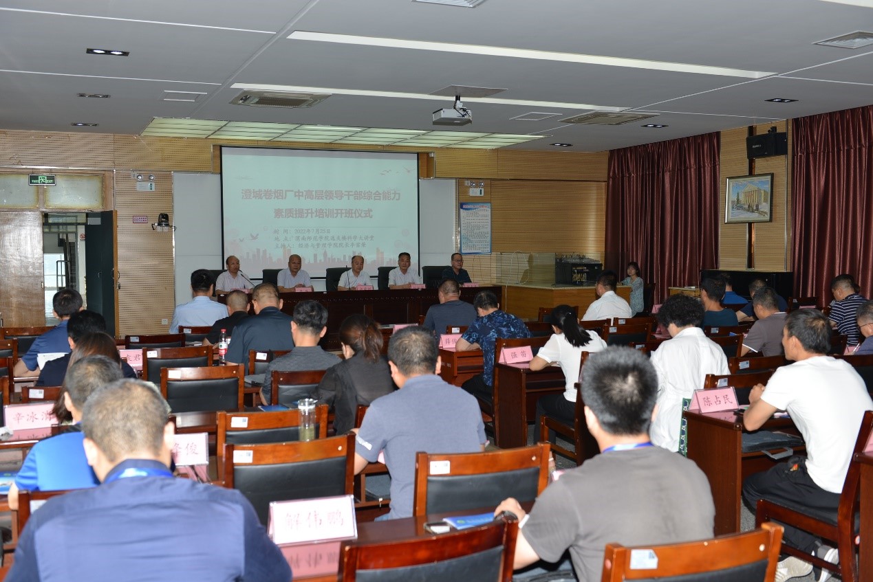 7月25日上午,中烟公司澄城卷烟厂中高层领导干部综合能力素质提升活动开班仪式在bat365官网逸夫楼科学大讲堂举行。副校长卢爱刚、经济与管理学院党总支书记魏光民,澄城卷烟厂厂长刘振宇、党委书记李磊及其他澄城卷烟厂中高层领导干部出席了此次开班仪式。仪式由经济与管理学院院长李富荣主持。