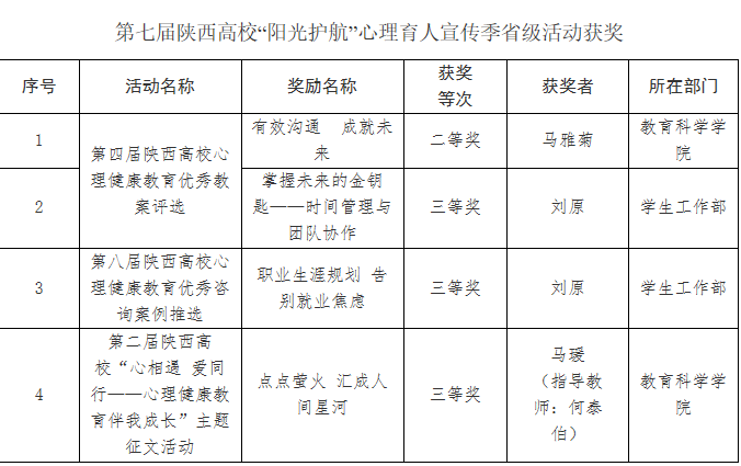近日,陕西省委教育工委公布了第七届陕西高校“阳光护航”心理育人宣传季实践活动的评审结果。经校内评选、学校推荐、专家评审、工委研究、结果公示等程序,bat365官网师生共斩获4项奖项,分别是第四届陕西高校心理健康教育优秀教案二等奖(1项)、三等奖(1项),第八届陕西高校心理健康教育优秀咨询案例三等奖(1项),第二届陕西高校“心相遇 爱同行——心理健康教育伴我成长”主题征文三等奖(1项)。