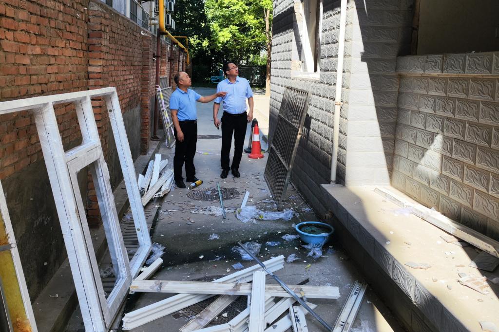 8月13日上午,副校长卢爱刚到9号住宅楼消防整改施工现场,督查消防整改工作。