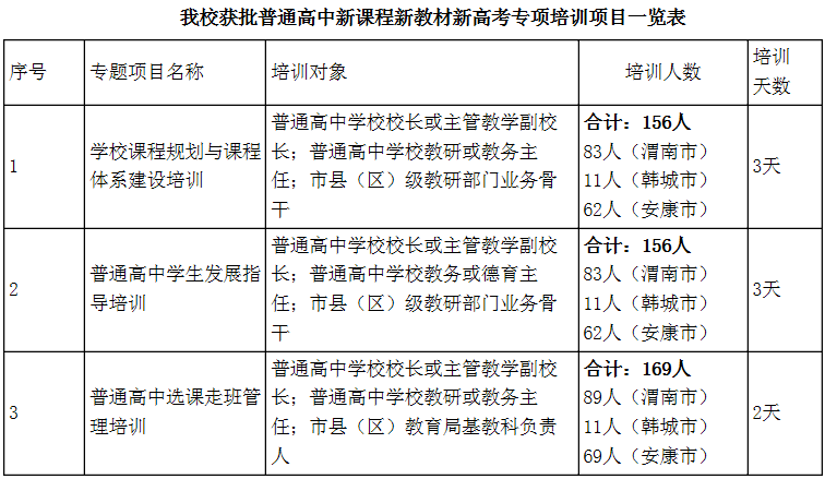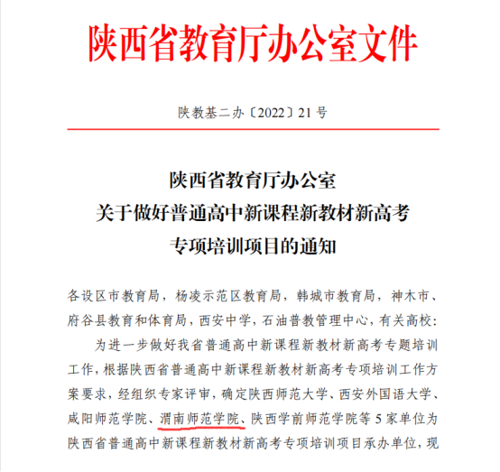 9月30日,陕西省教育厅办公室发布了《关于做好普通高中新课程新教材新高考专项培训项目的通知》(陕教基二办〔2022〕21 号),全省共5家单位被确定为承办单位,bat365官网成功入选,承担培训人数481人。这是省教育厅首次设立该项目。