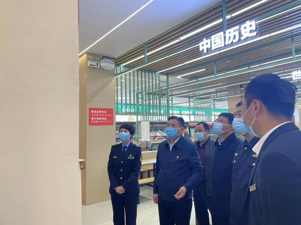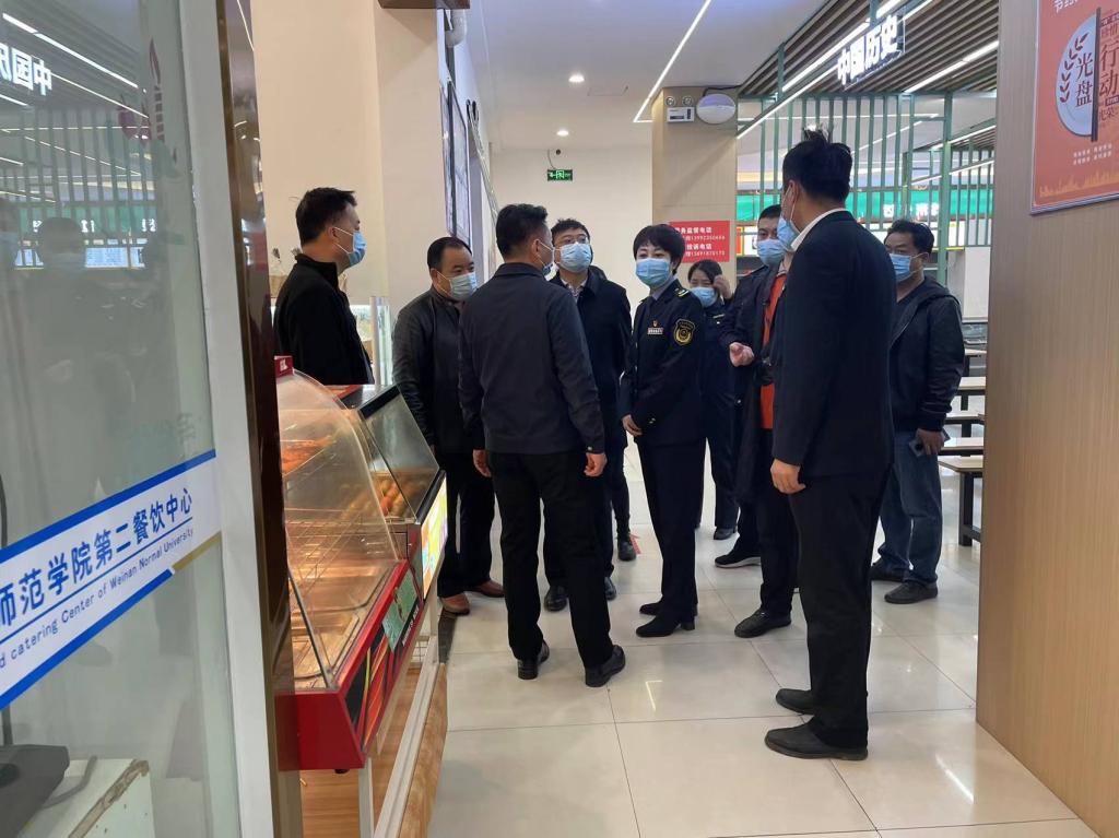11月2日下午,渭南市市场监督管理局党组书记周庆文,餐饮管理科科长孙雯,临渭区市场监管管理局副局长赵玲一行三人,在临渭区站南市场监管所副所长任磊和监管责任人田芳、耿卫兵的陪同下来bat365官网学生餐厅检查工作。重点对秋季校园食品安全和落实“眼见为‘食’”工作进行了专项督查。副校长常青林与学校后勤服务中心相关人员迎接了检查。