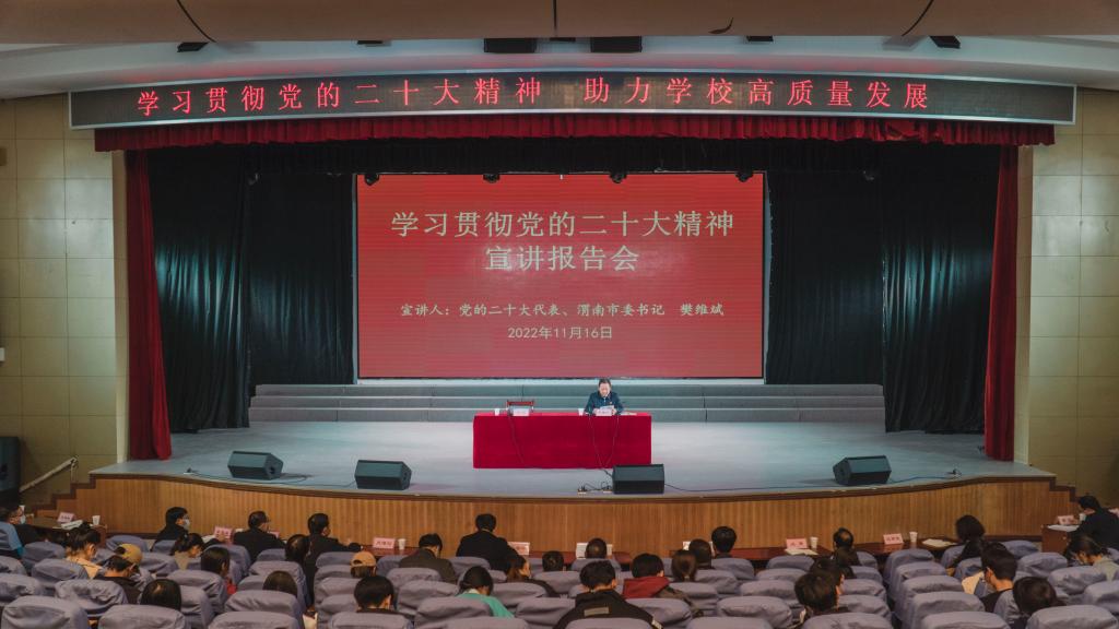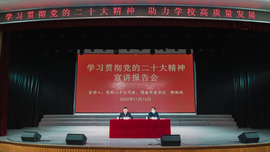 11月16日,党的二十大代表、渭南市委书记樊维斌走进bat365官网为师生代表宣讲党的二十大精神。党委书记卓宇主持报告会。
