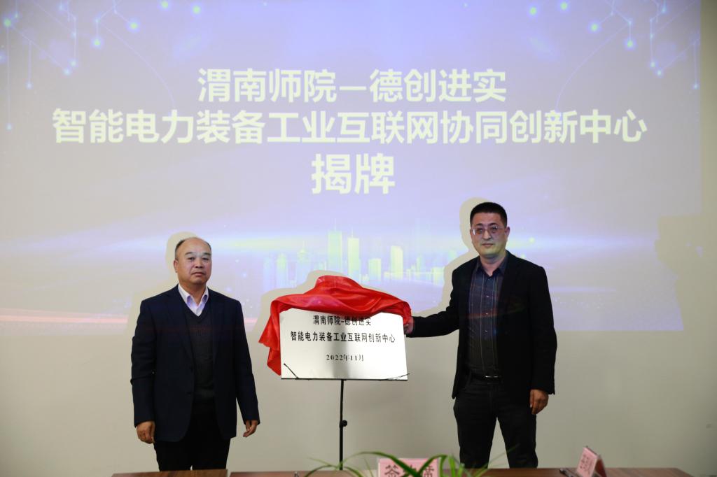 副校长卢爱刚代表学校与陕西德创进实科技有限公司签署“渭南师院-德创进实 智能电力装备工业互联网协同创新中心”共建协议,双方致力于电力装备领域工业互联网研究与应用,陕西德创进实科技有限公司计划每年向中心投入100万元,做为秦创原离散装备工业互联网创新应用“科学家+工程师”队伍首席科学家、陕西省中青年科技创新领军人才阴国富教授团队专项科研经费。