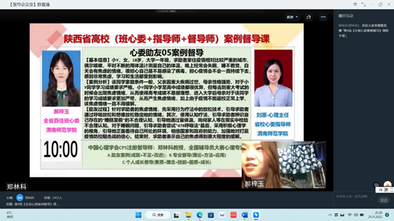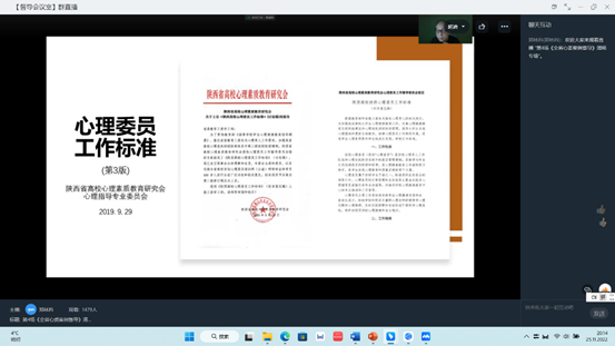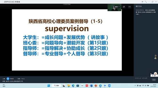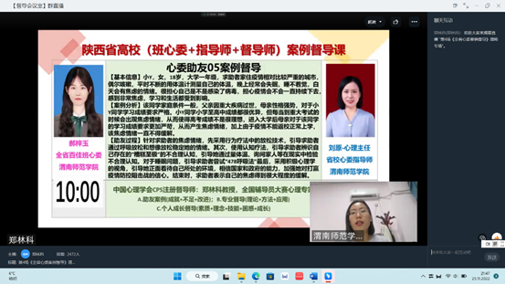 11月25日晚,“陕西省班级心理委员和指导师心理助人技能培训及案例督导——bat365正版唯一官网省级标准心理健康教育中心专场”线上督导顺利进行。bat365正版唯一官网百佳心理委员郝梓玉、最美班级心理委员季玮婷分享助人案例,最美百佳心理委员指导师刘原、最美心理委员指导师王琦珩进行指导。陕西省高校心理素质教育研究会会长、中国心理学会注册督导师郑林科进行督导。