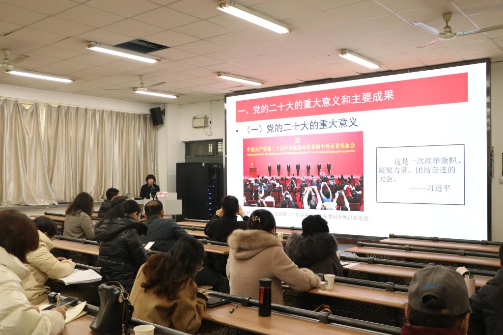 市委宣讲团成员,市委党校副校长宋筱改教授以《全面建设社会主义现代化国家的政治宣言和行动纲领》为题,阐释了党的二十大的重大意义和主要成果,梳理了党的二十大报告的框架结构,系统解读了党的二十大的主要精神。同时,结合渭南实际,结合高等教育特点,提出了学习宣传贯彻党的二十大精神的几点要求。报告历时两个多小时,结构清晰、内容丰富、重点突出。