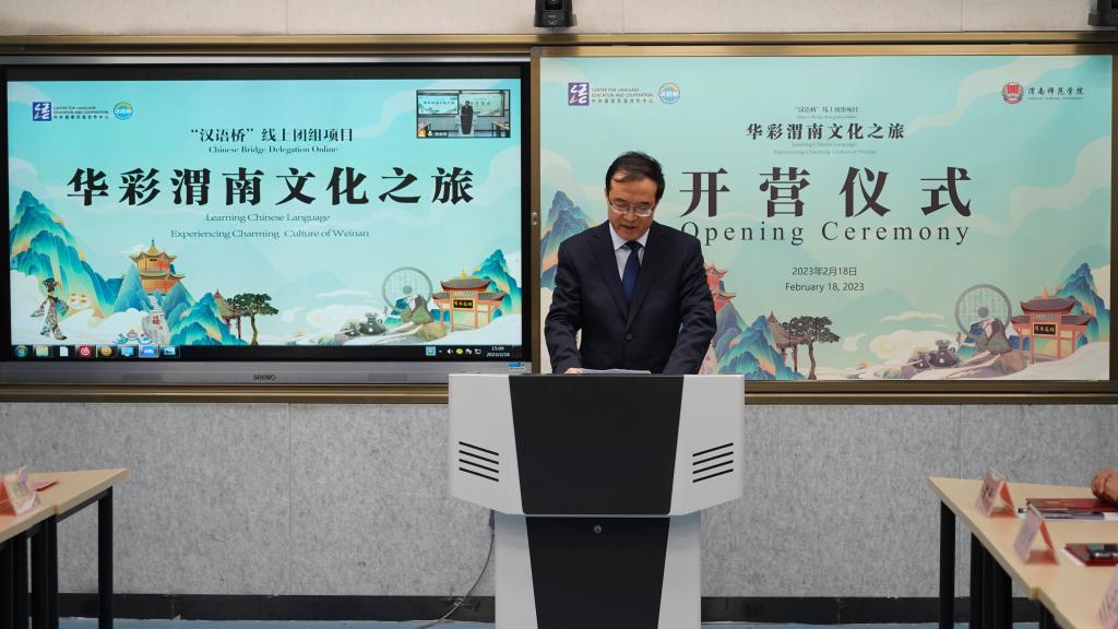 2月18日北京时间15:00,bat365官网举行“汉语桥”线上团组项目——华彩渭南文化之旅体验营开营仪式。副校长曹强出席仪式并讲话。开营仪式由国际教育学院院长杜百顺主持。