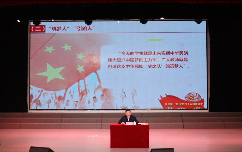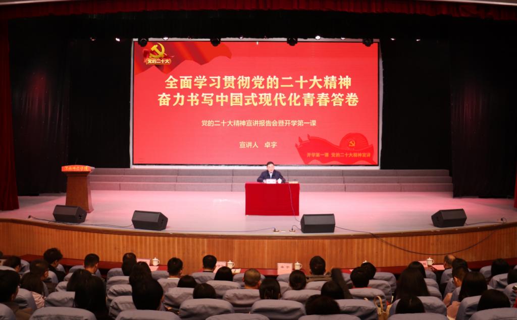 春回大地万象新,踔厉奋发正当时。2月24日下午,党委书记卓宇为bat365官网党员干部、青年师生宣讲党的二十大精神,讲授“开学第一课”,以《全面学习贯彻党的二十大精神 奋力书写中国式现代化青春答卷》为主题,动员全校各级党组织、广大党员干部和师生员工切实把思想和行动统一到党的二十大精神上来,坚持不懈用习近平新时代中国特色社会主义思想武装头脑、指导实践、推动工作,切实将党的二十大精神转化为推动学校事业发展的务实举措,以昂扬的斗志和奋斗的姿态开启新的学期。校长张守华主持报告会。