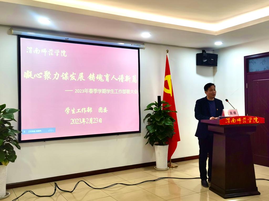 学生工作部部长田耿辉从疫情防控网格化管理、思想政治教育创新工作、辅导员工作站建设、学生工作亮点及突出成绩等方面对2022年主要学生工作进行回顾,并以《携手奋进 守正创新 数字赋能 铸魂育人》为题,结合2023年学生工作总体思路,对2023年春季学期重点学生工作进行部署。