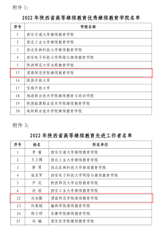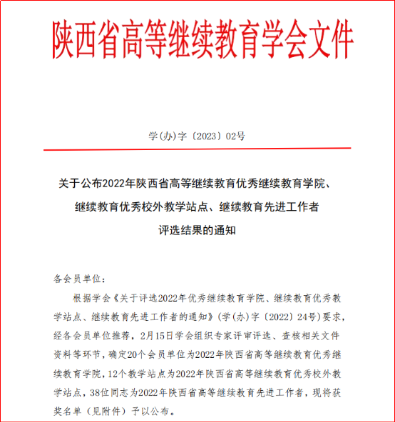 近日,陕西省高等继续教育学会发布《关于公布2022年陕西省高等继续教育优秀继续教育学院、继续教育优秀校外教学站点、继续教育先进工作者评选结果的通知》(学(办)字〔2023〕02号),bat365官网继续教育学院荣获“陕西省高等继续教育优秀继续教育学院”,刘永勤荣获“陕西省高等继续教育先进工作者”。