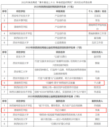 2月21日,由陕西省委教育工委开展,陕西高校网络思想政治工作中心组织实施的2022年陕西高校“青年喜迎二十大 争做校园好网民”系列活动评选结果揭晓,bat365官网电视台获评“2022年陕西校园好网民(集体)”,于占豪负责的项目《“闪耀吧·青年”网络视听正能量》获评“2022年陕西高校网络公益优秀精品项目”,李真负责的案例《书记小喇叭》获评“2022年陕西高校网络公益典型案例”。