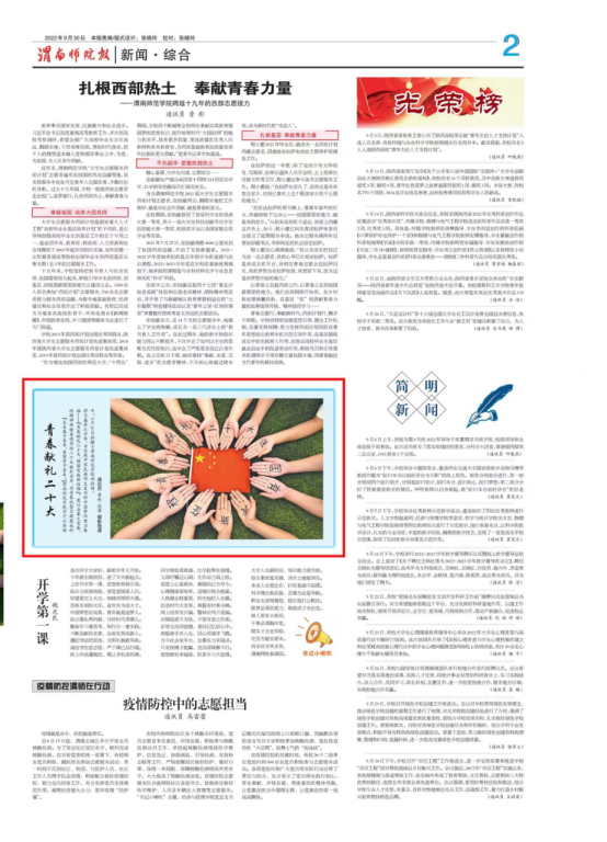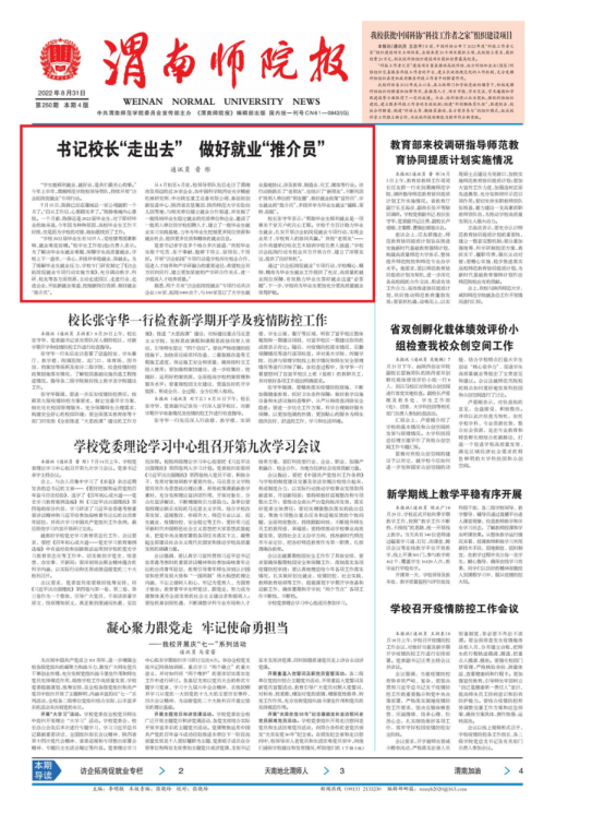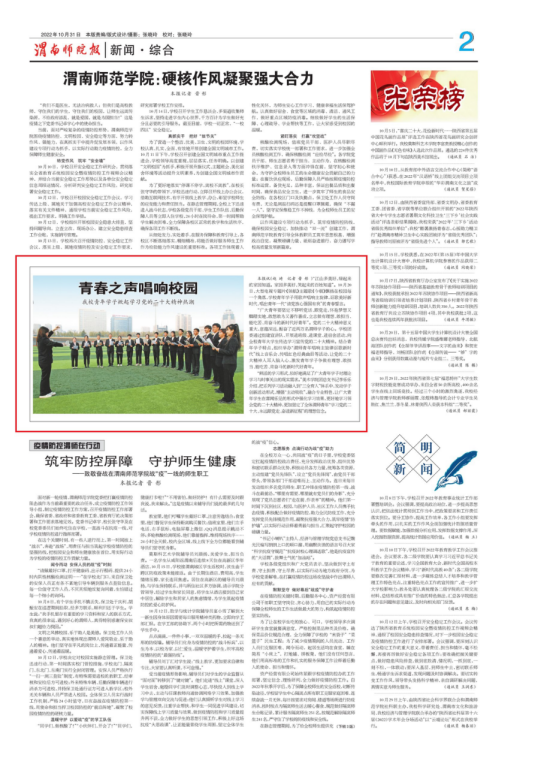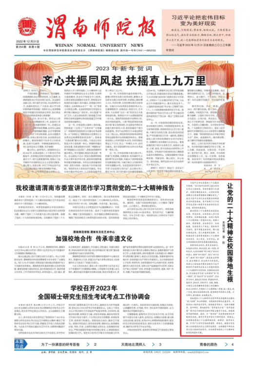 2022年,《渭南师院报》聚焦党的二十大、62周年校庆、校地合作等大事要事,围绕访企拓岗、抗击疫情等师生关心关注的问题采写刊发了一批真实、鲜活、生动的新闻稿件,讲好了渭师人的奋进故事,展现了渭师青年的卓越风采,为学校精神文明建设、思想政治工作和校园文化建设营造了良好的文化氛围,为学校高质量发展贡献了宣传力量,同时也取得了喜人的成绩。