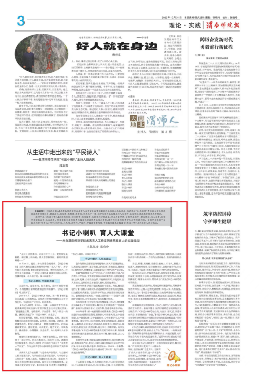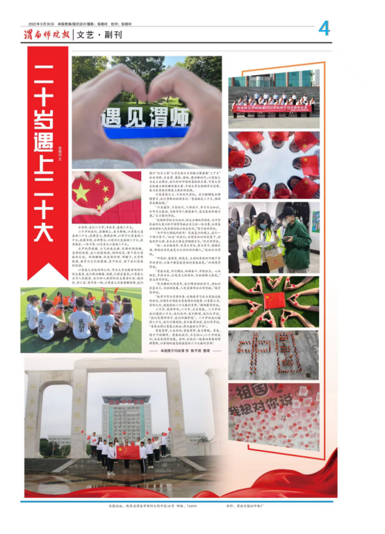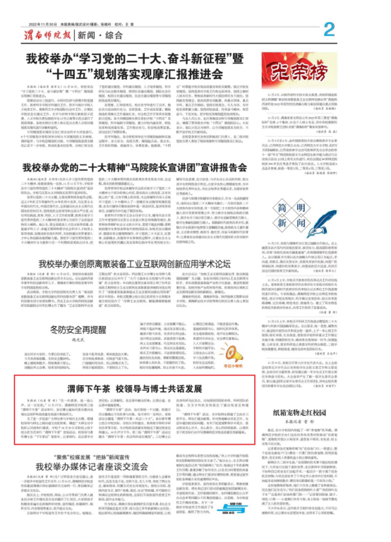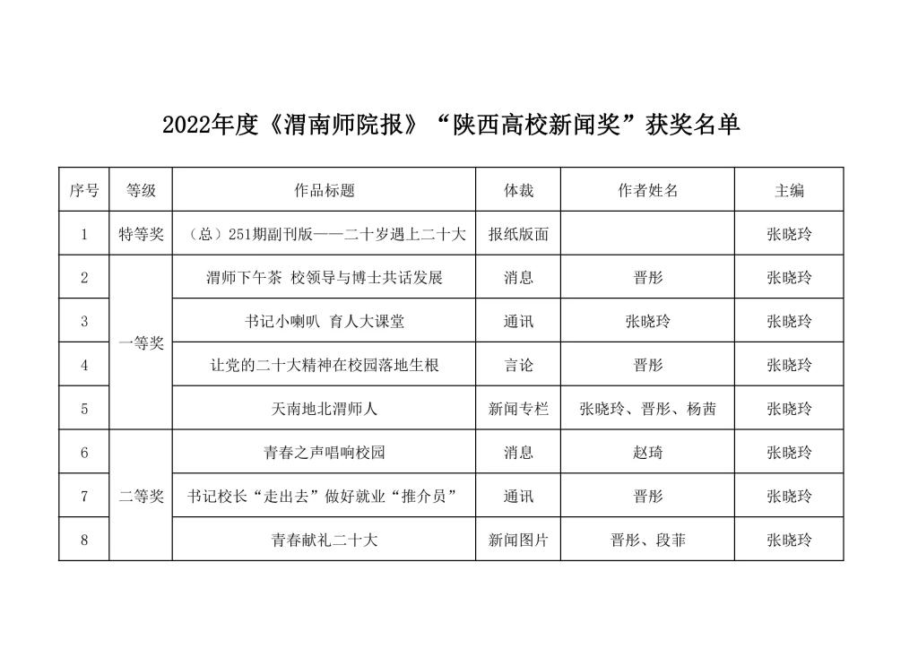 《渭南师院报》推荐的,张晓玲编辑的(总)251期副刊《二十岁遇上二十大》获“报纸版面类”特等奖;晋彤采写的《渭师下午茶 校领导与博士共话发展》获“消息类”一等奖,张晓玲采写的《书记小喇叭育人大课堂》获“通讯类”一等奖,晋彤采写的《让党的二十大精神在校园落地生根》获“言论类”一等奖,张晓玲、晋彤、杨茜采写和主持的《天南地北渭师人》获“新闻专栏类”一等奖;赵琦采写的《青春之声 唱响校园》获“消息类”二等奖,晋彤采写的《书记校长“走出去” 做好就业“推介员”》获“通讯类”二等奖,晋彤、段菲拍摄的《青春献礼二十大》获“新闻图片类”二等奖。(记者 王索 审核人 李明敏)