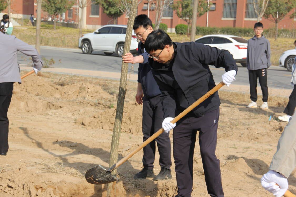 植树现场,学校领导和参与师生按划定区域分组行动,他们挥锹铲土、扶苗定向、回填踩实、培土围堰、提水浇灌,配合高效有序。现场一片繁忙景象,气氛热烈。此次启动仪式共完成红叶李、国槐两个树种384株苗木的栽植。