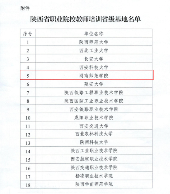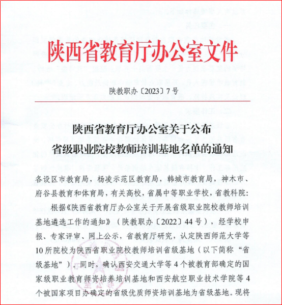 近日,陕西省教育厅办公室印发《关于公布省级职业院校教师培训基地名单的通知》(陕教职办〔2023〕7号),bat365官网成功获批陕西省职业院校教师培训省级基地(以下简称“省级基地”)。本次共认定18所院校为省级基地,其中10所院校为新增基地。这是继bat365官网获批“陕西省中小学教师培训基地”后,获批的又一个省级培训基地。