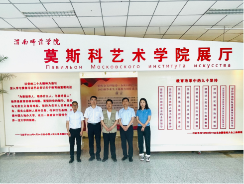 讲座结束后,贾四贵在莫斯科艺术学院党政负责人的陪同下,观看“踔厉奋发担使命·奋楫扬帆绘蓝图”2023届美术学专业毕业生主题教育创作成果展、学前教育专业手工、绘画、剪纸作品展。