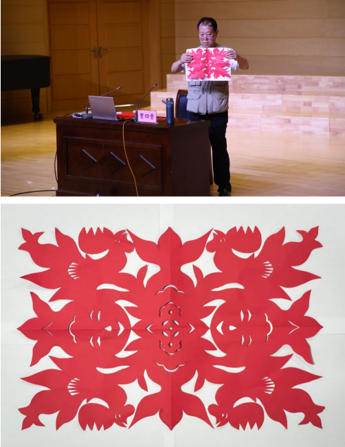 贾四贵在讲座中指出,中国剪纸艺术是时代文明进步的标志,是中华优秀传统文化的结晶。阐述了中国剪纸艺术的起源与发展阶段,解析了中国剪纸艺术造象符号的象征寓意,并结合自己的剪纸作品阐明剪纸艺术创作要承古创新。还现场为师生们展示了剪纸作品“鸡鸣盛世,年年有鱼”。