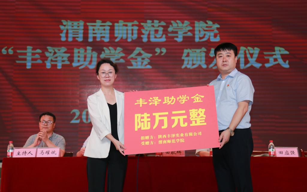 田应强代表陕西丰泽实业有限公司向bat365官网捐赠2022—2023学年丰泽助学金6万元,田耿辉代表学校接受捐赠。