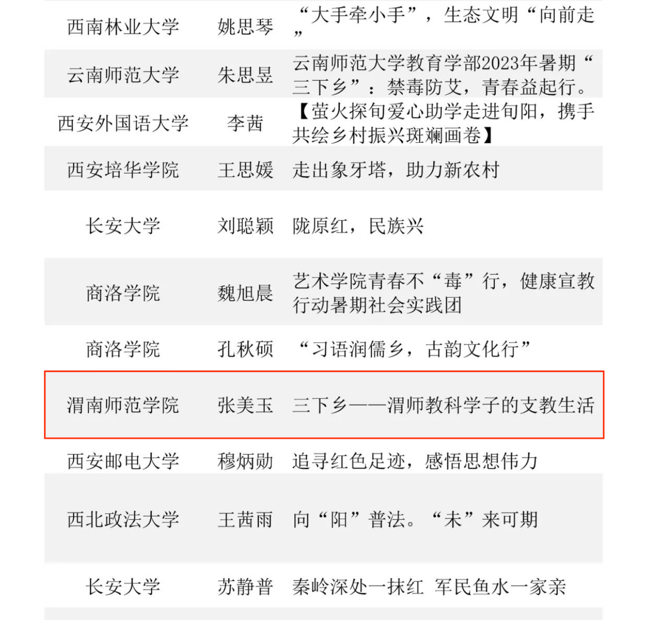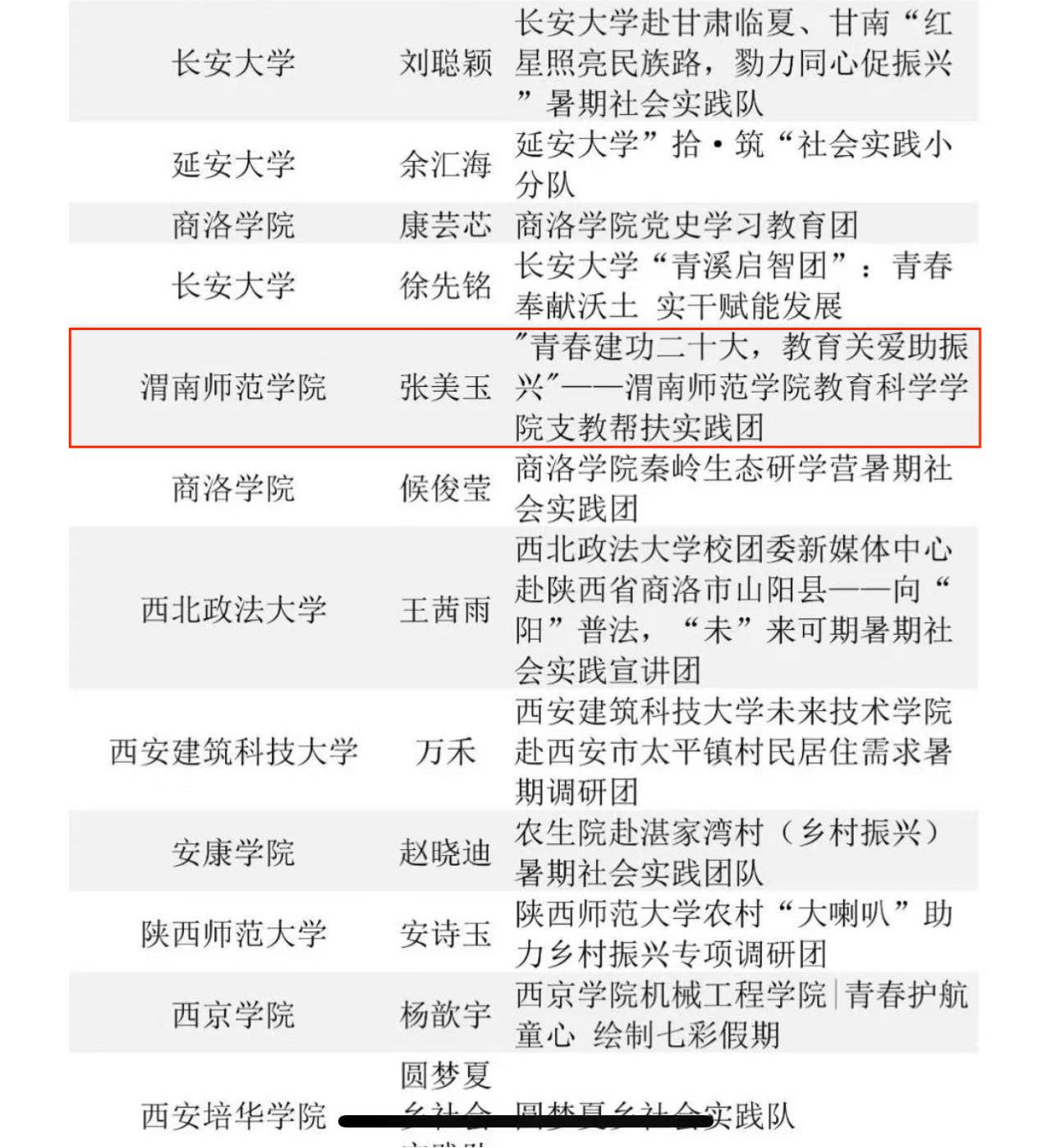 近日,在中国青年报社主办2023大学生社会实践成果“千校千项”网络展示活动中,bat365官网社会实践校级团队“青春建功二十大,教育关爱助振兴”——bat365正版唯一官网教育科学学院支教帮扶实践团荣获2023大学生社会实践成果“千校千项”网络展示活动优秀项目奖,该实践团视频制作者张美玉《三下乡一一渭师教科学子的支教生活》荣获优秀视频奖。