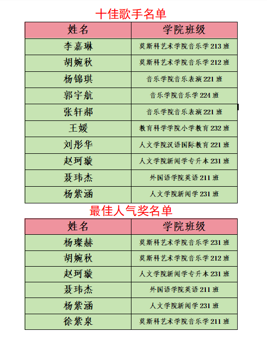 本次“校园十佳歌手”比赛历时35天,共有近300人次积极报名参加,经过三场海选和两场复赛层层选拔,进入决赛的21组选手强强对决。民歌、流行歌曲、说唱RAP……每位选手带来了不同风格的演出,在舞台上绽放出最有活力的姿态。最终,10组选手成功荣获“校园十佳歌手”称号。